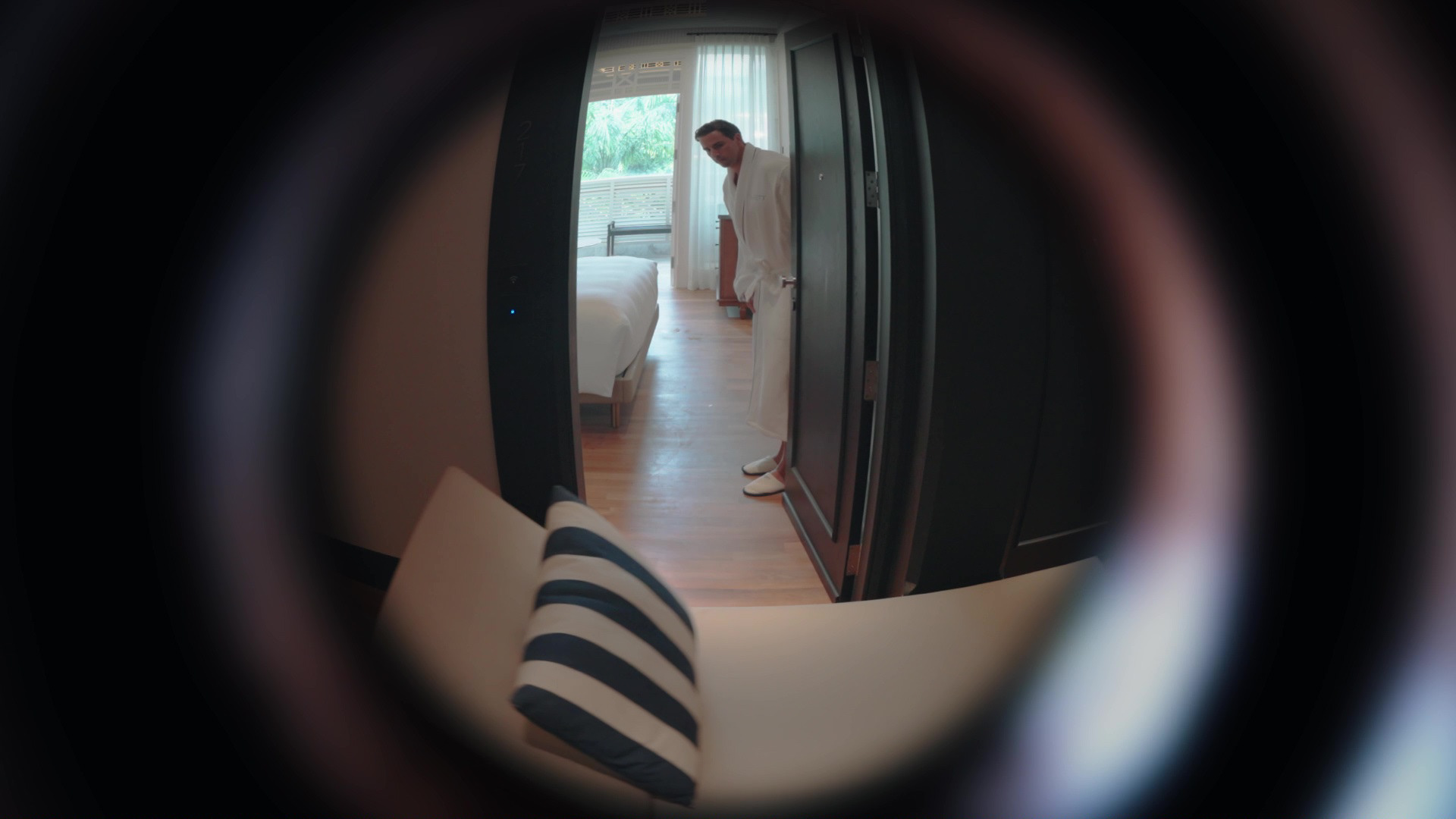 Once inside the hotel, the umbrella and sunbed break apart and move in opposite directions. This visual contrast highlights their individual personalities as they explore the heritage architecture.